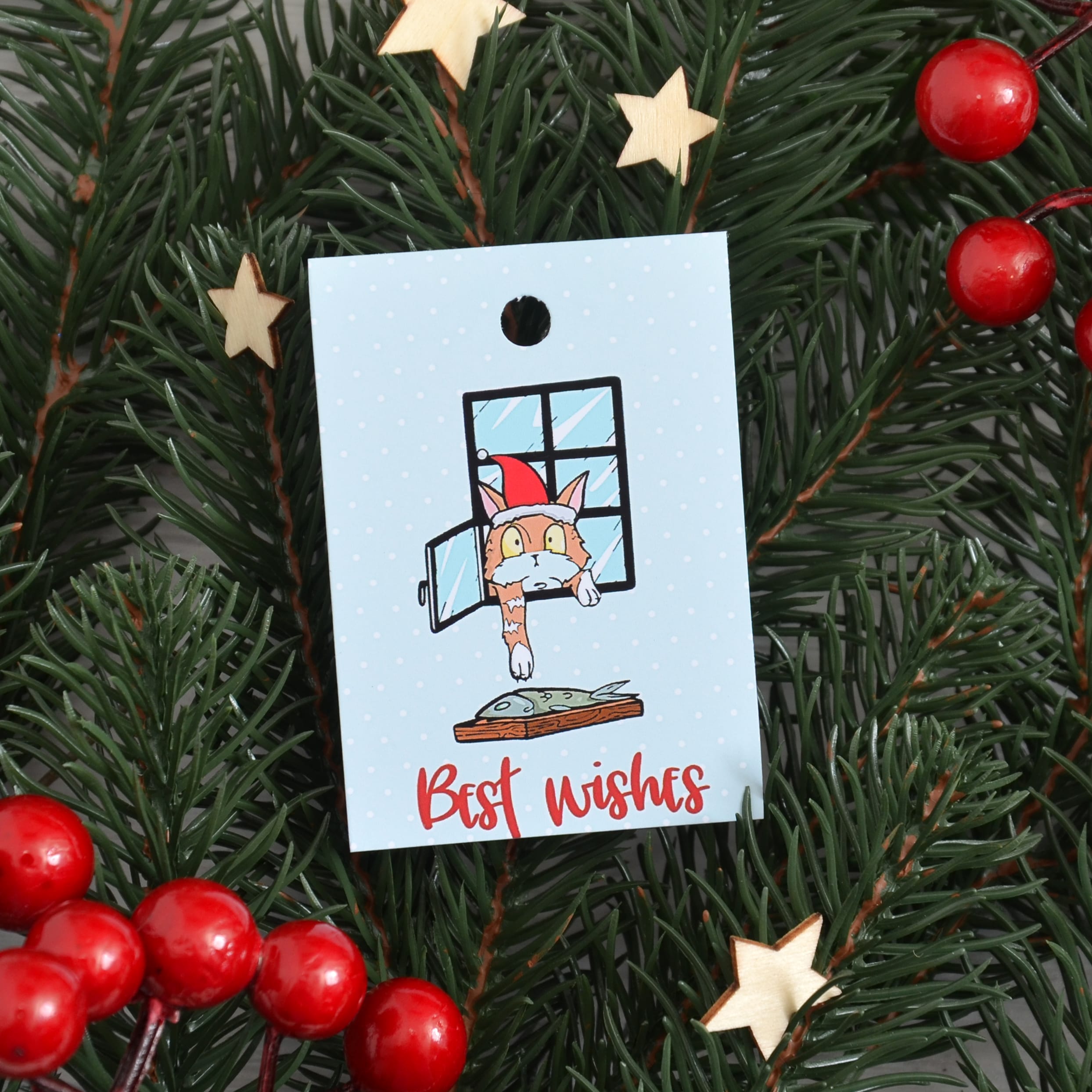 Бірка новорічна 50*70 мм Best Wishes киця з рибкою