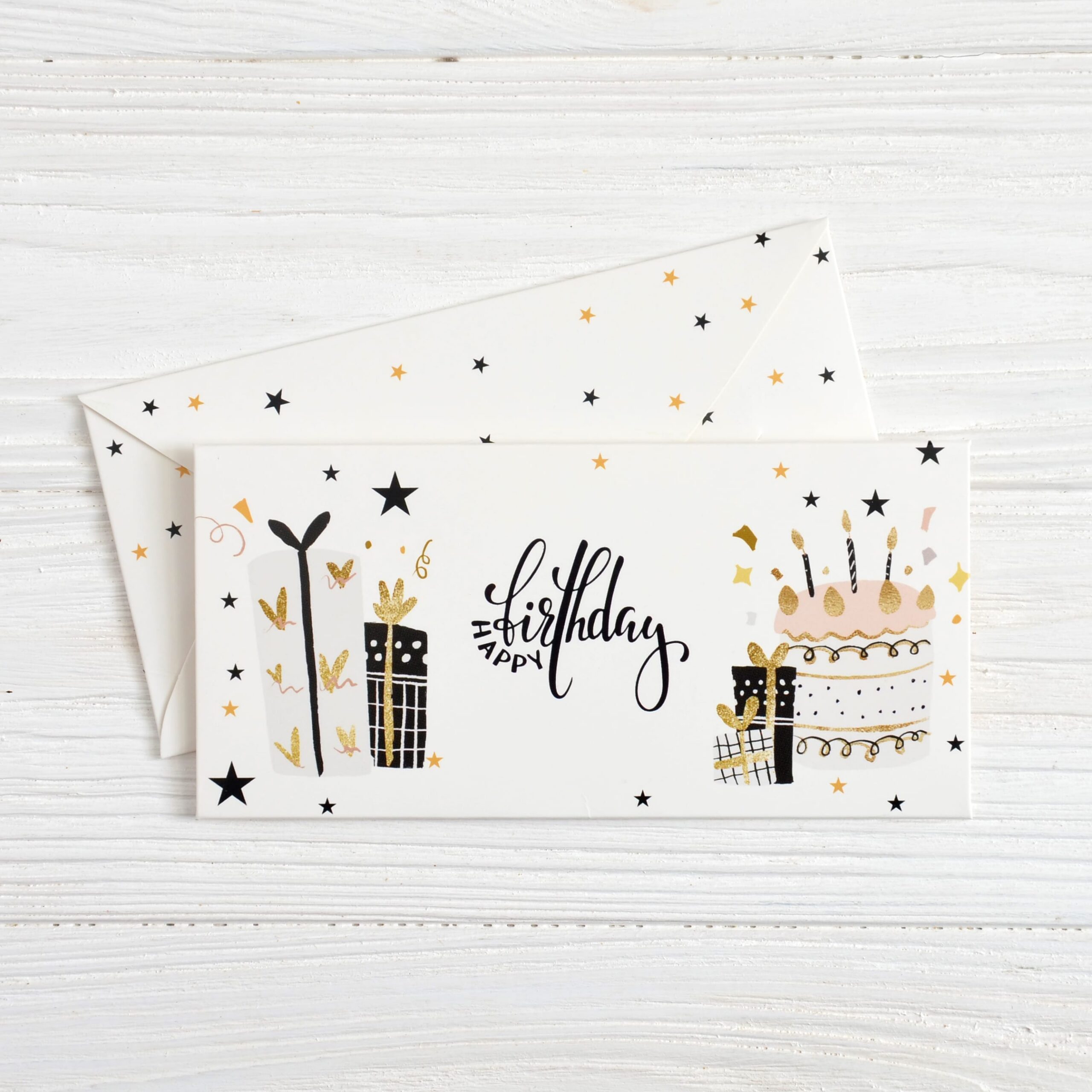 Конверт для грошей 167*83 мм Happy Birthday Торт та подарунки золоті