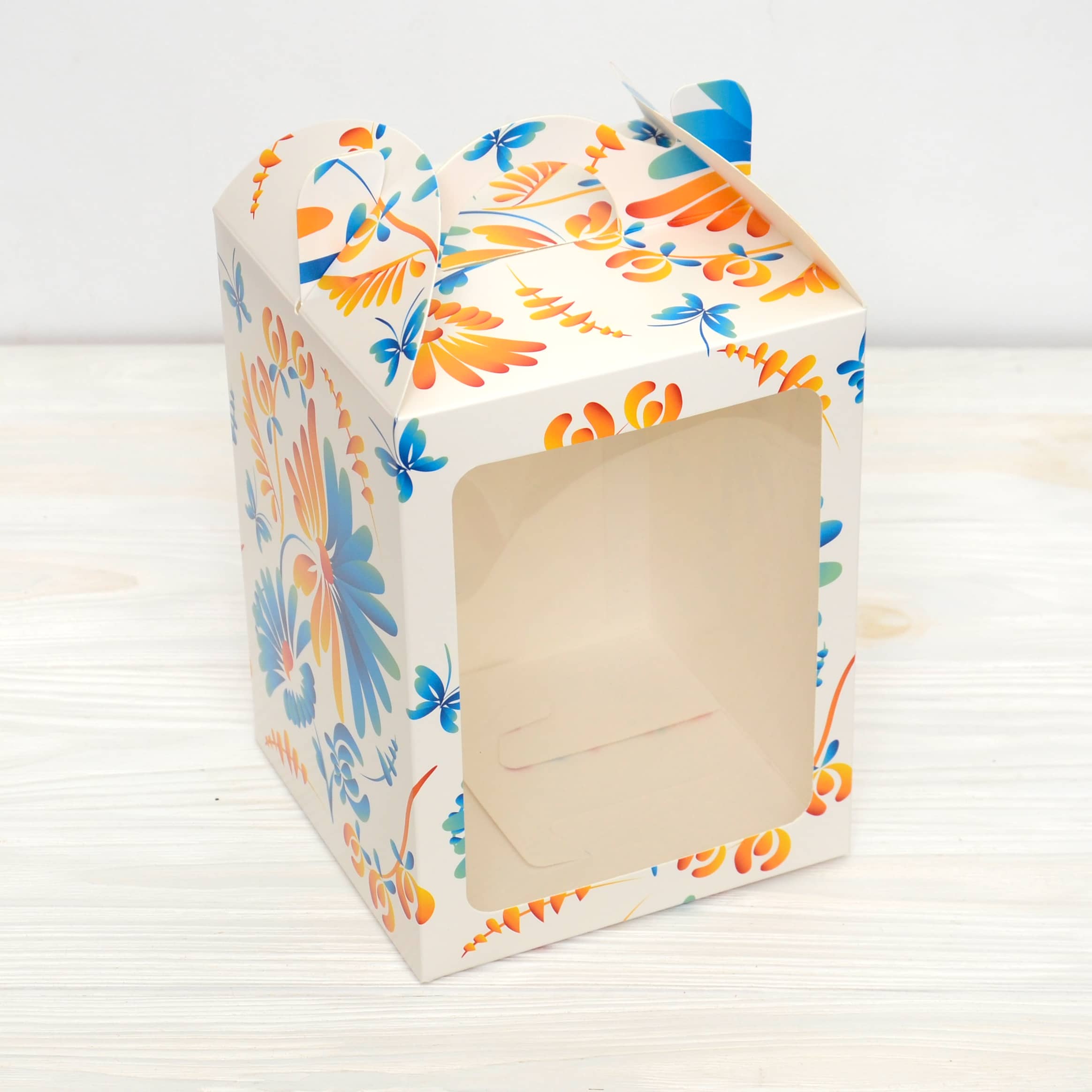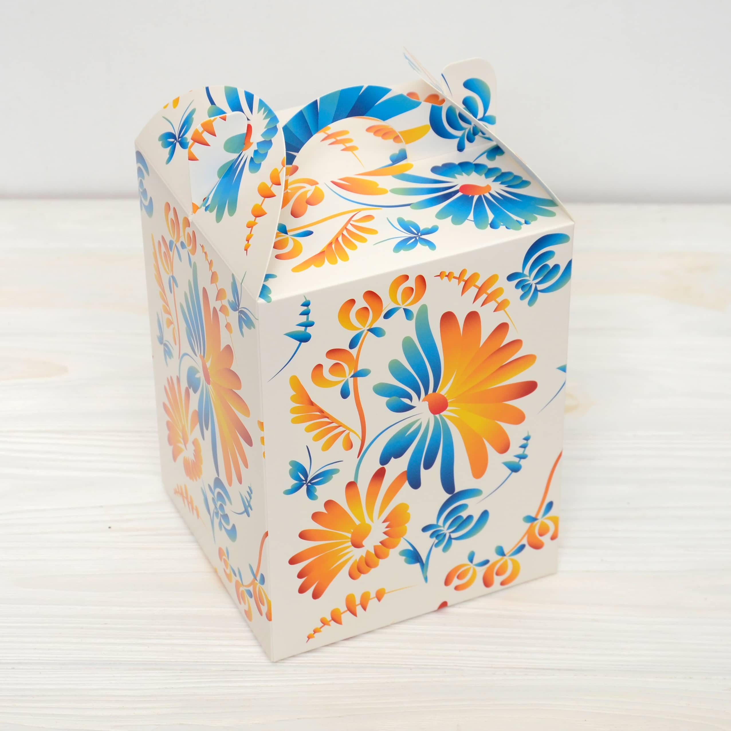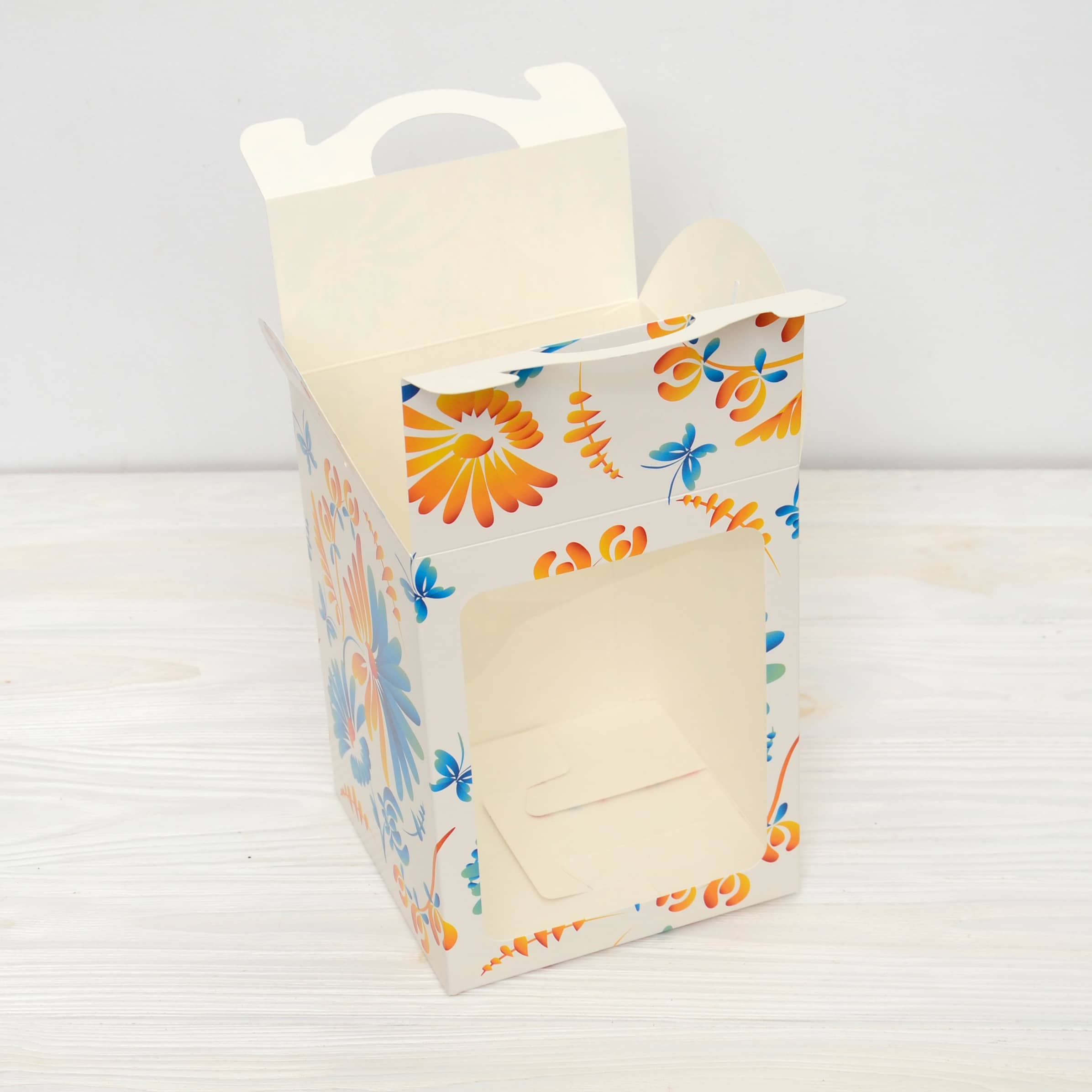 Конструкція – суцільна самозбірна коробка з ручкою та клапанами зверху.