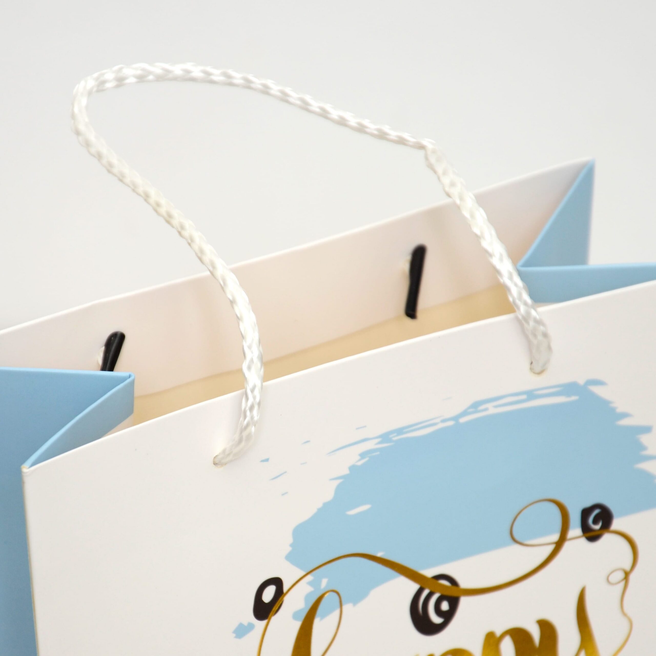 Особливості – друк з фольгуванням, ручки з плетеного поліестрового шнура з фіксаторами на кінчиках, подвійна проклейка дна.