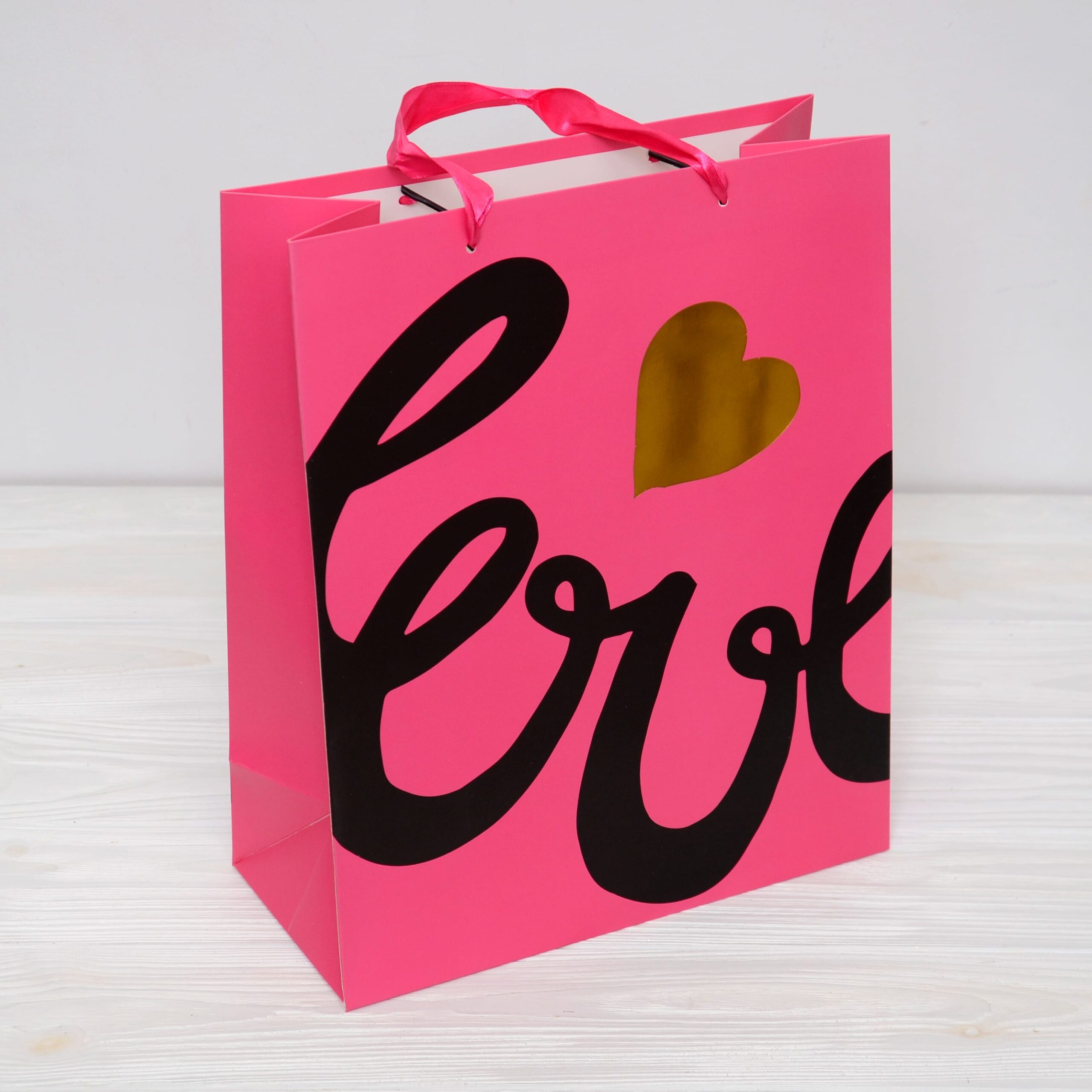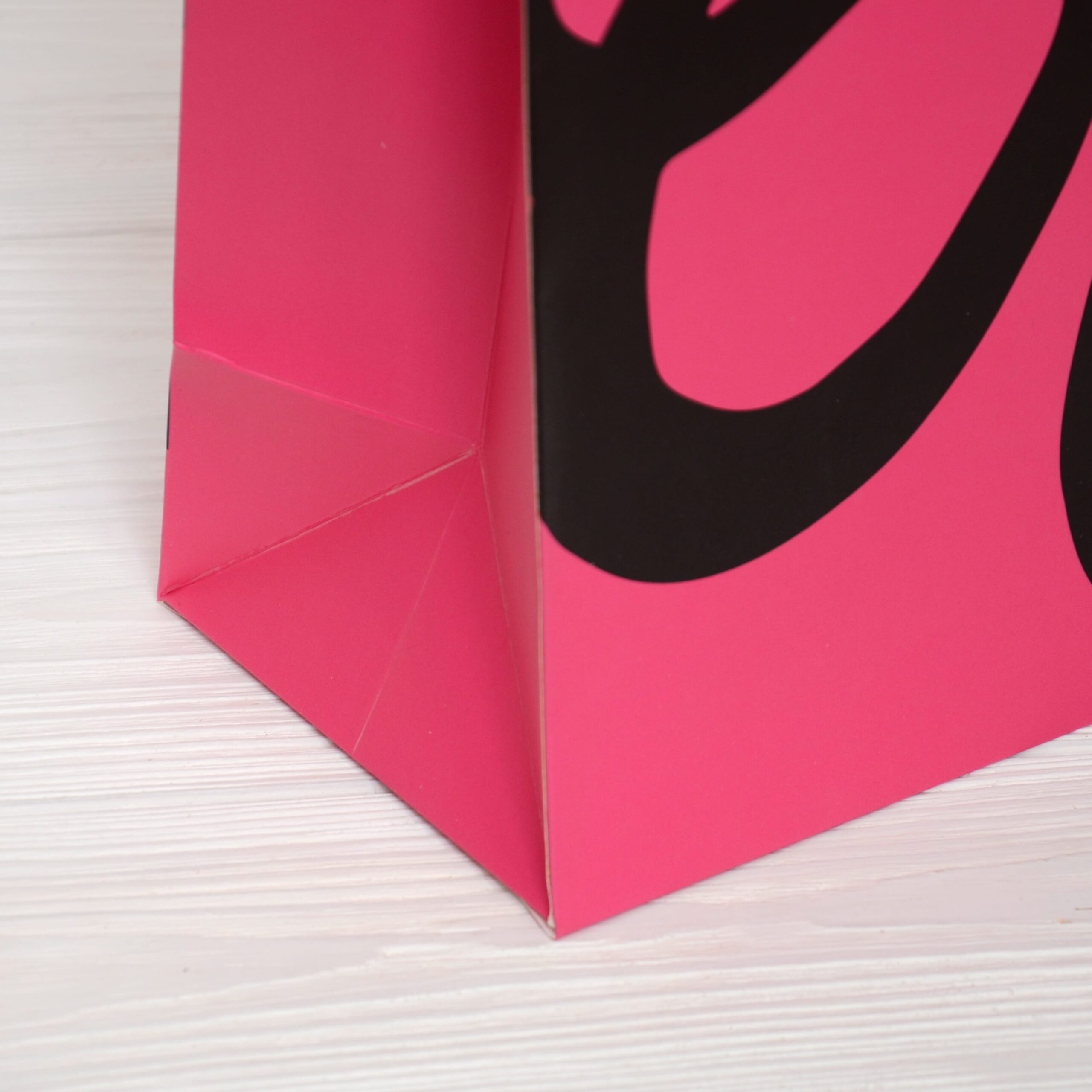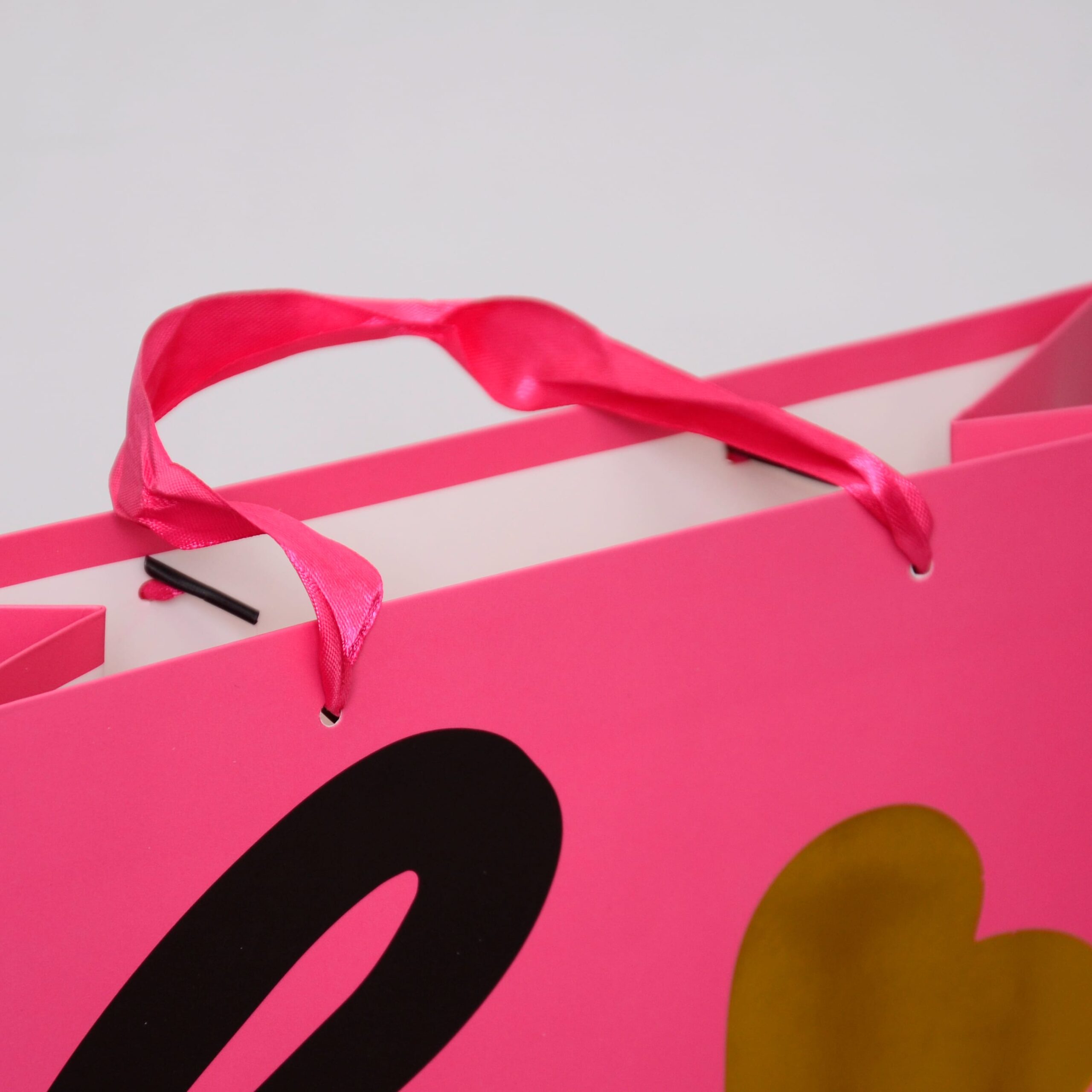 Особливості – друк з фольгуванням, ручки з атласної стрічки з фіксаторами на кінчиках, подвійна проклейка дна.