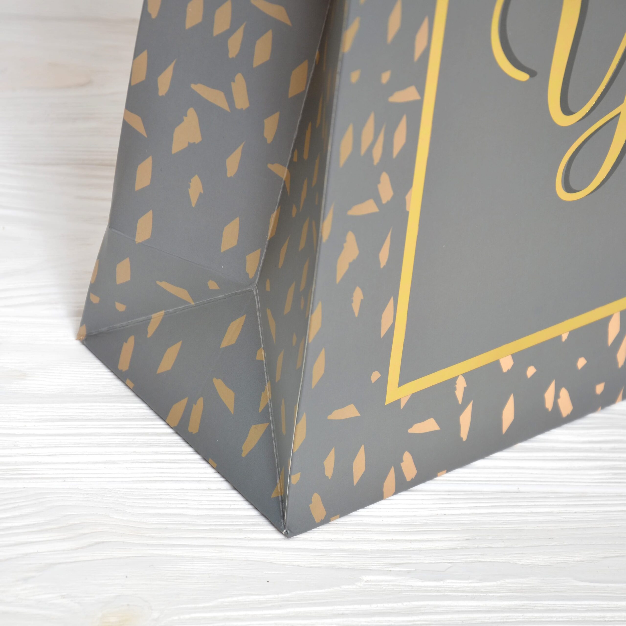 Особливості – друк з фольгуванням, ручки з плетеного поліестрового шнура з фіксаторами на кінчиках, подвійна проклейка дна.